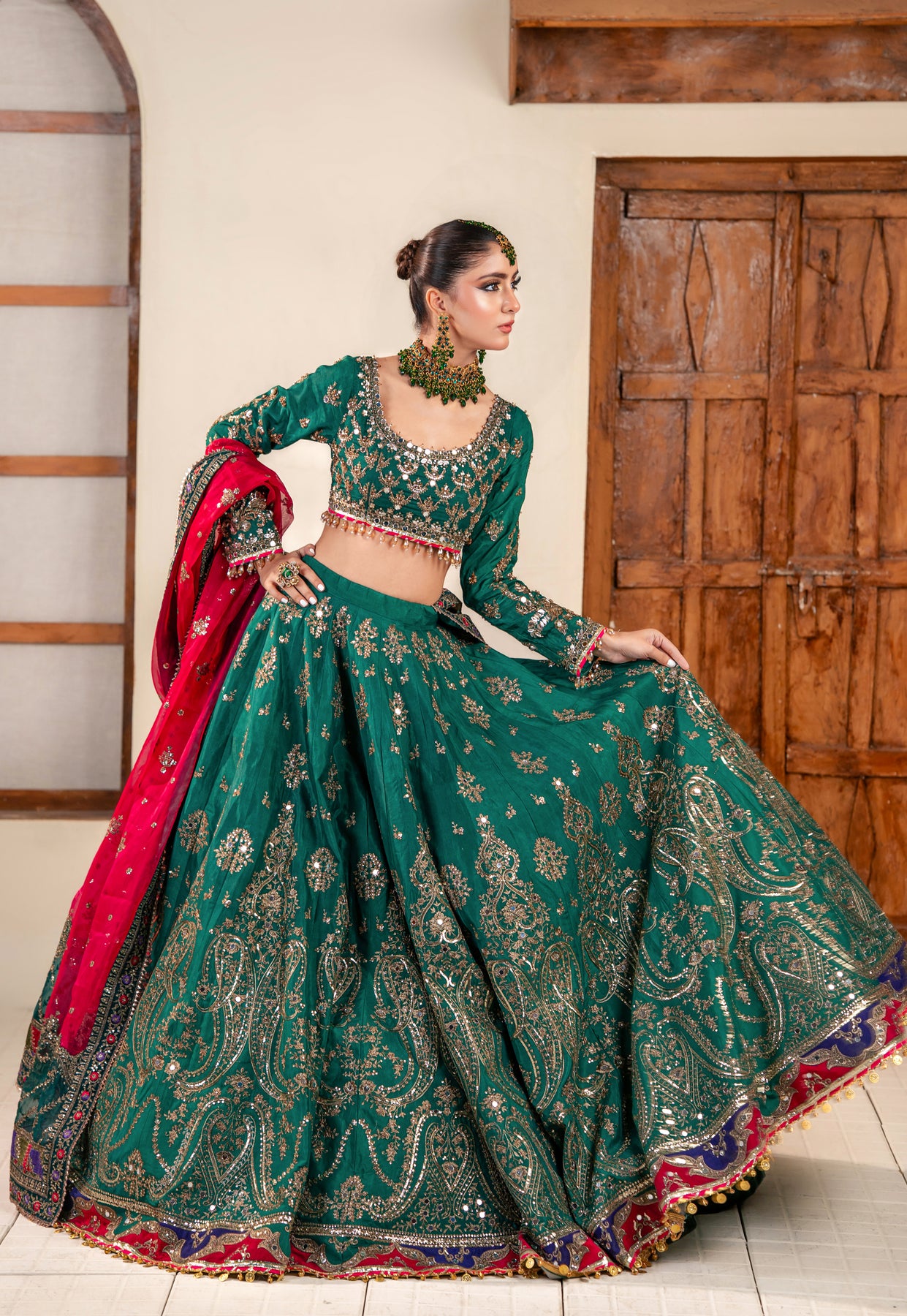 Step into royal elegance with Kashee’s Bridal Wear | KBW-127, a breathtaking emerald green bridal lehenga accented with a striking deep pink dupatta