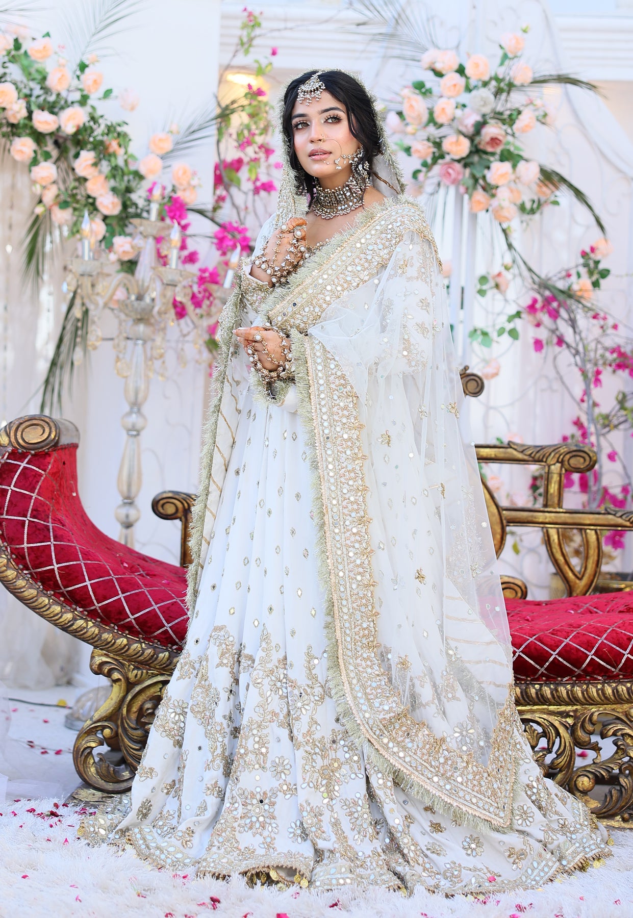 A fully hand-embroidered bridal frock crafted on a Raw silk base in white, designed with intricate traditional motifs. The frock is richly embellished using gold zari, tilla, naqshi, dabka, sitara, sheesha, cut dana, work, creating a heavily detailed and luxurious bridal texture that exudes elegance and royalty.