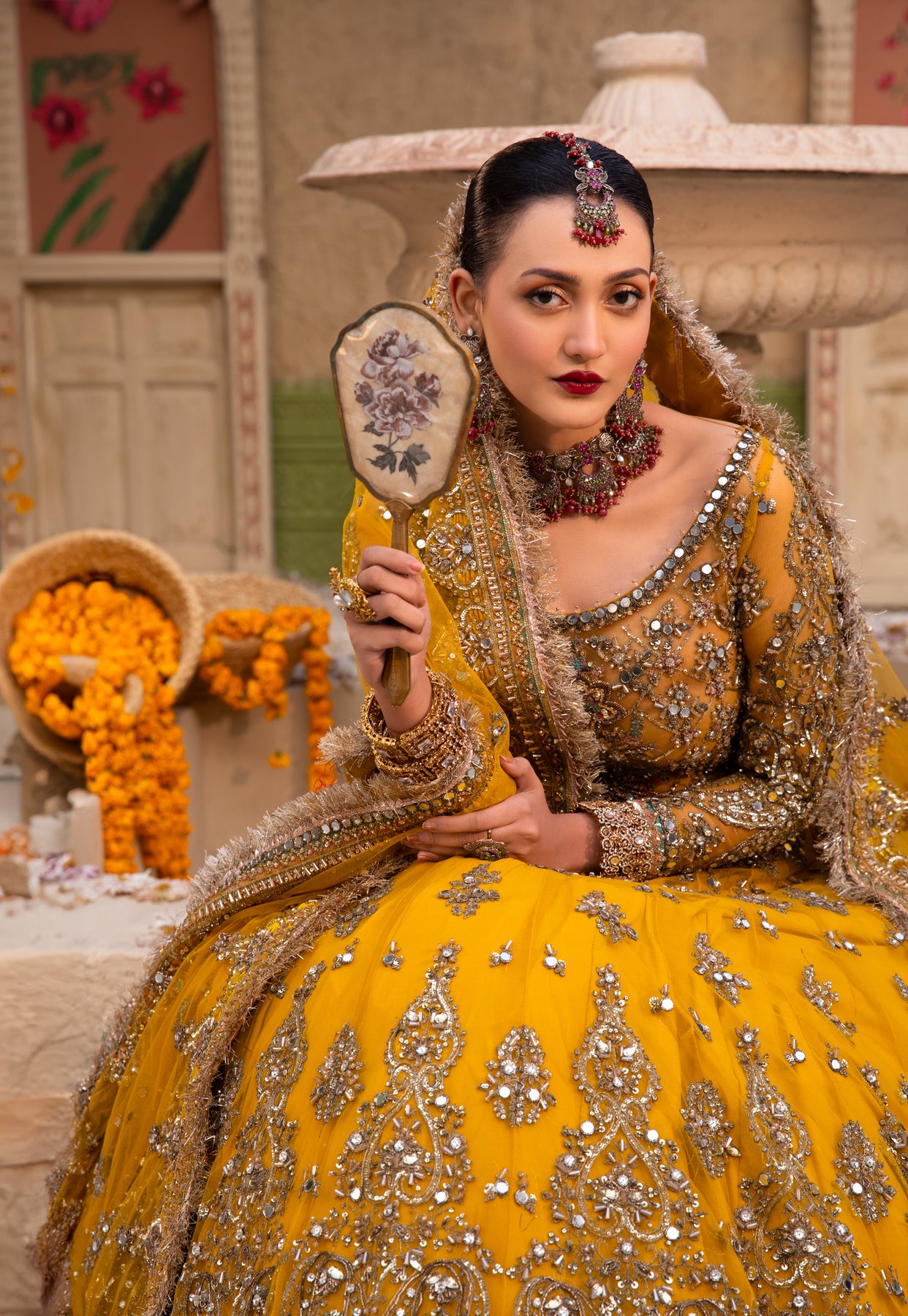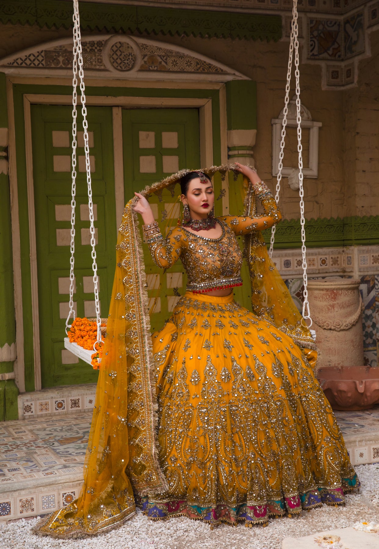 A luxurious net dupatta in a rich yellow tone, gracefully flowing with an elegant trail. The dupatta is adorned with heavy traditional embroidery spread delicately all over, featuring a regal mix of gold zari, gold dory, sitara, dabka, kundan, sheesha, cut dana, and pearl work. A four-sided hand-embroidered in Red color purple border enhances its grandeur, finished with refined gold thread detailing for a truly royal bridal finish.