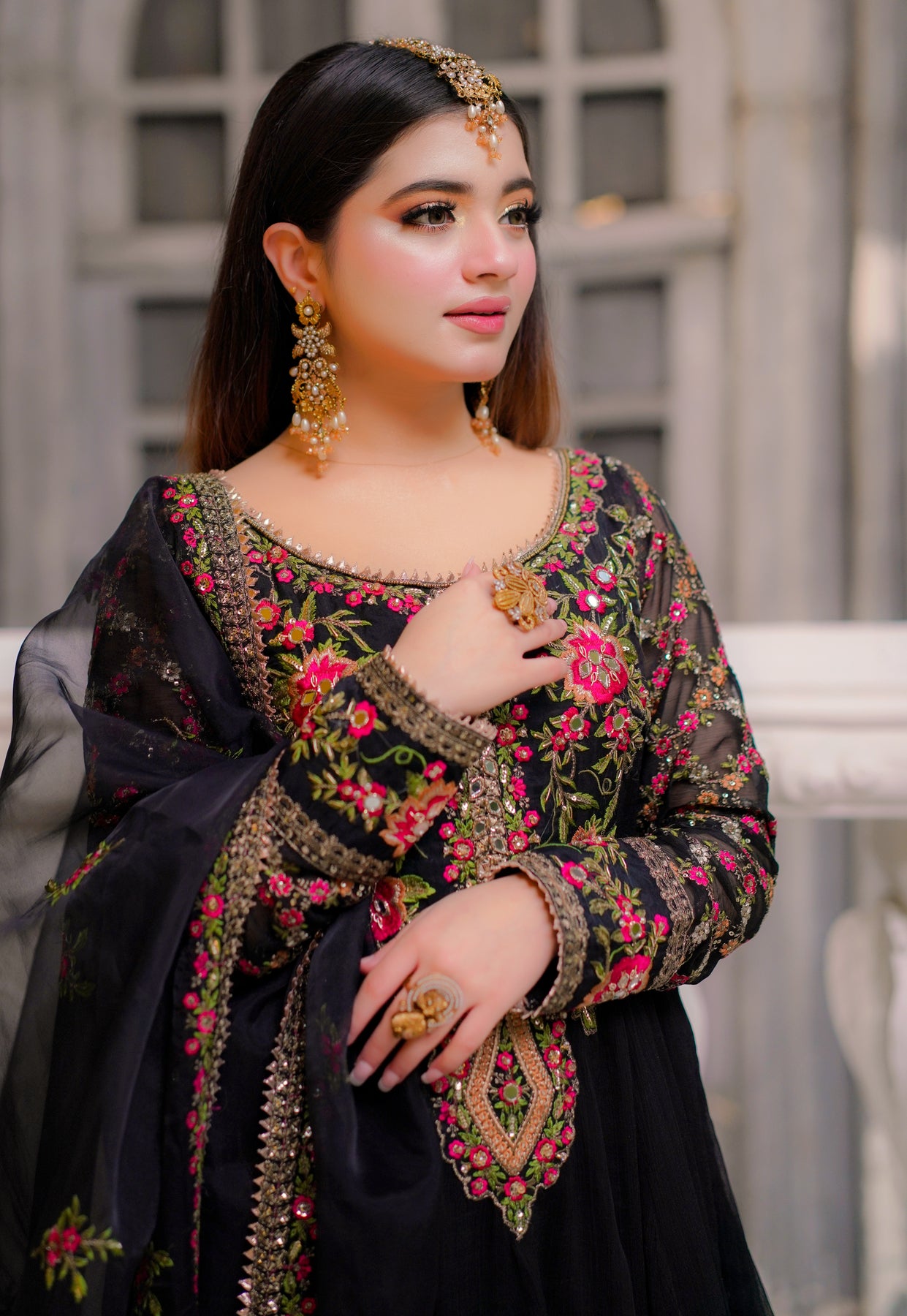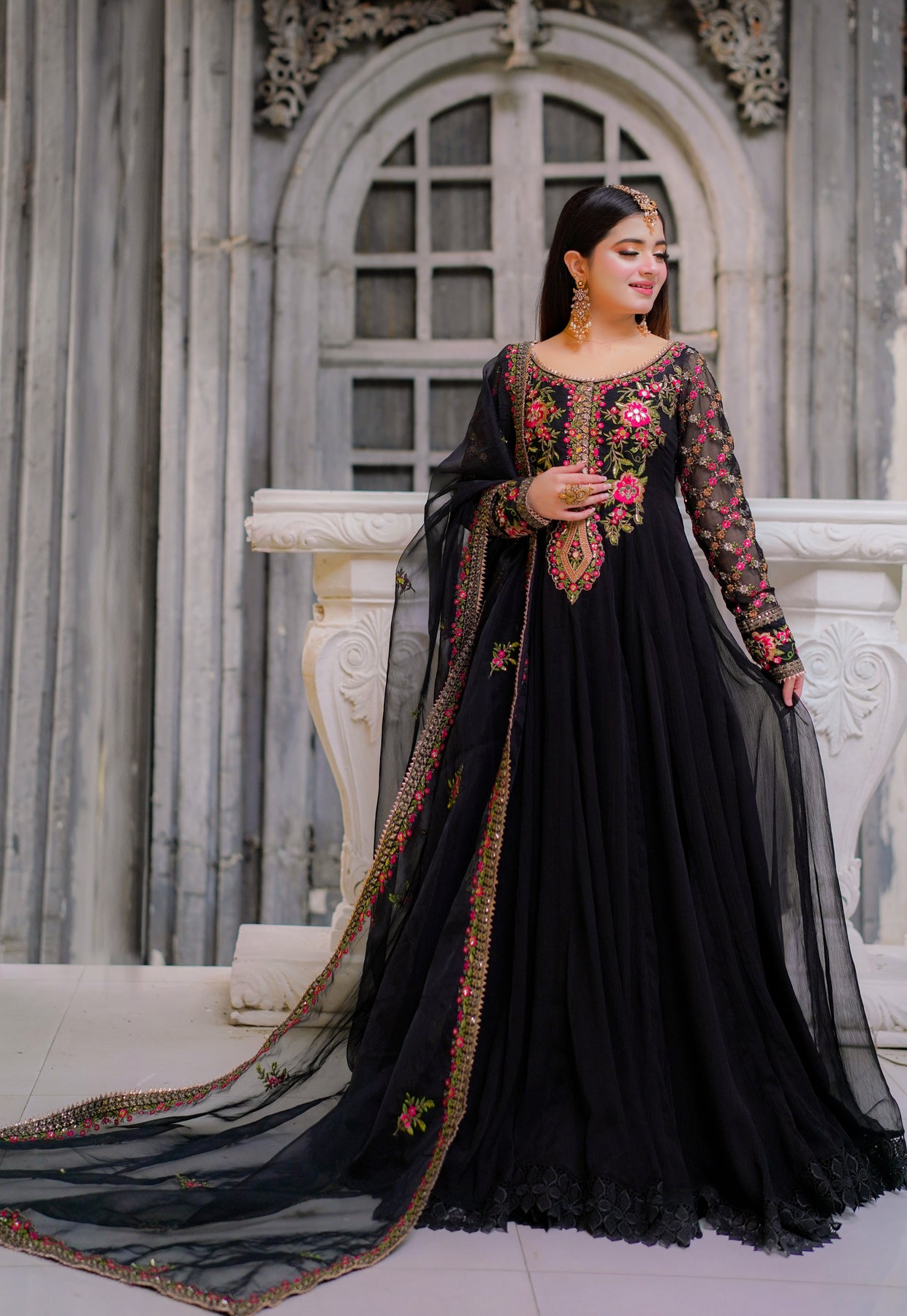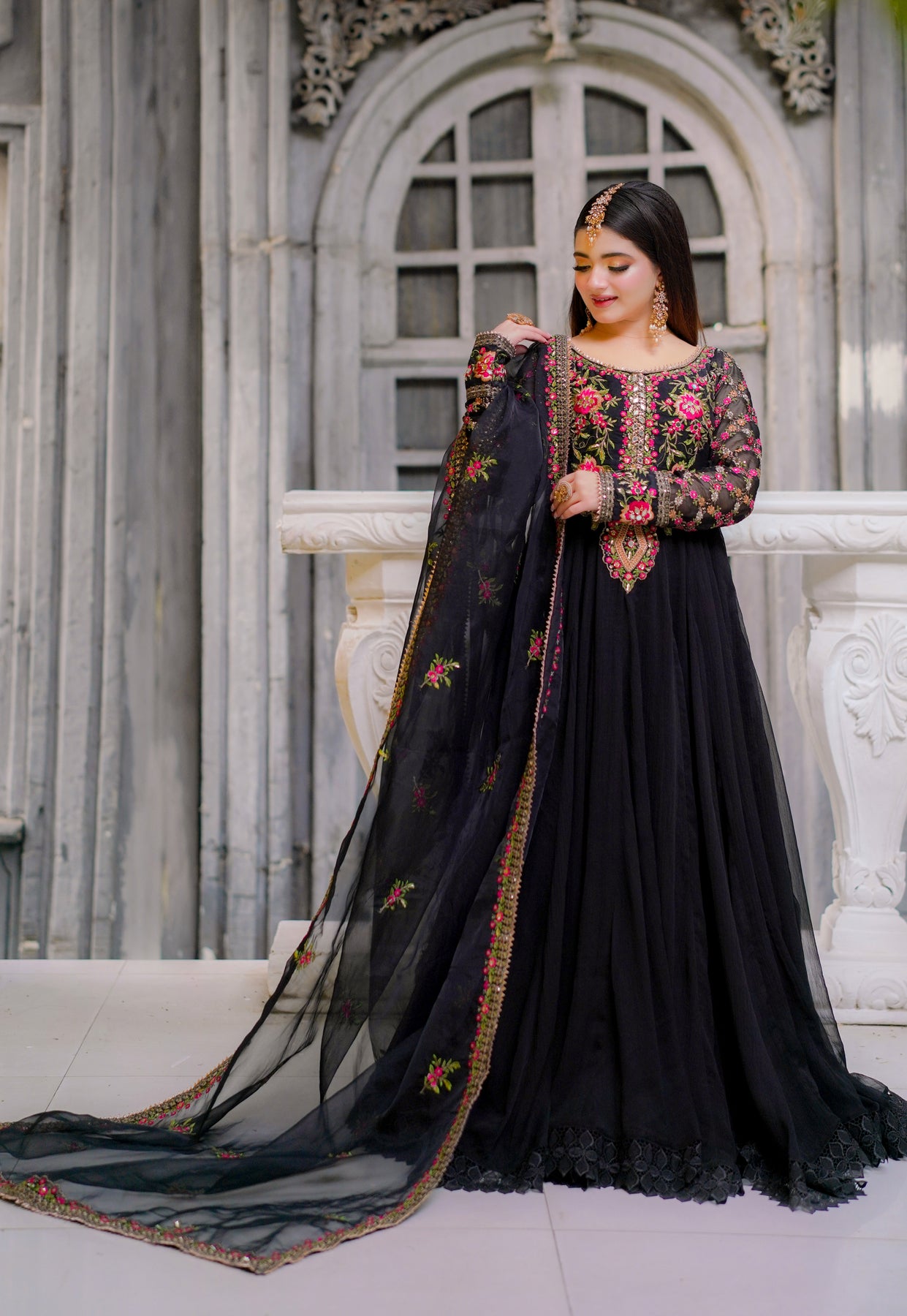 A 2.75-yard sheer dupatta finished with a finely embroidered four-sided border. The border is delicately adorned with floral motifs in vibrant resham shades, highlighted with subtle zari work, adding a graceful contrast against the black base.