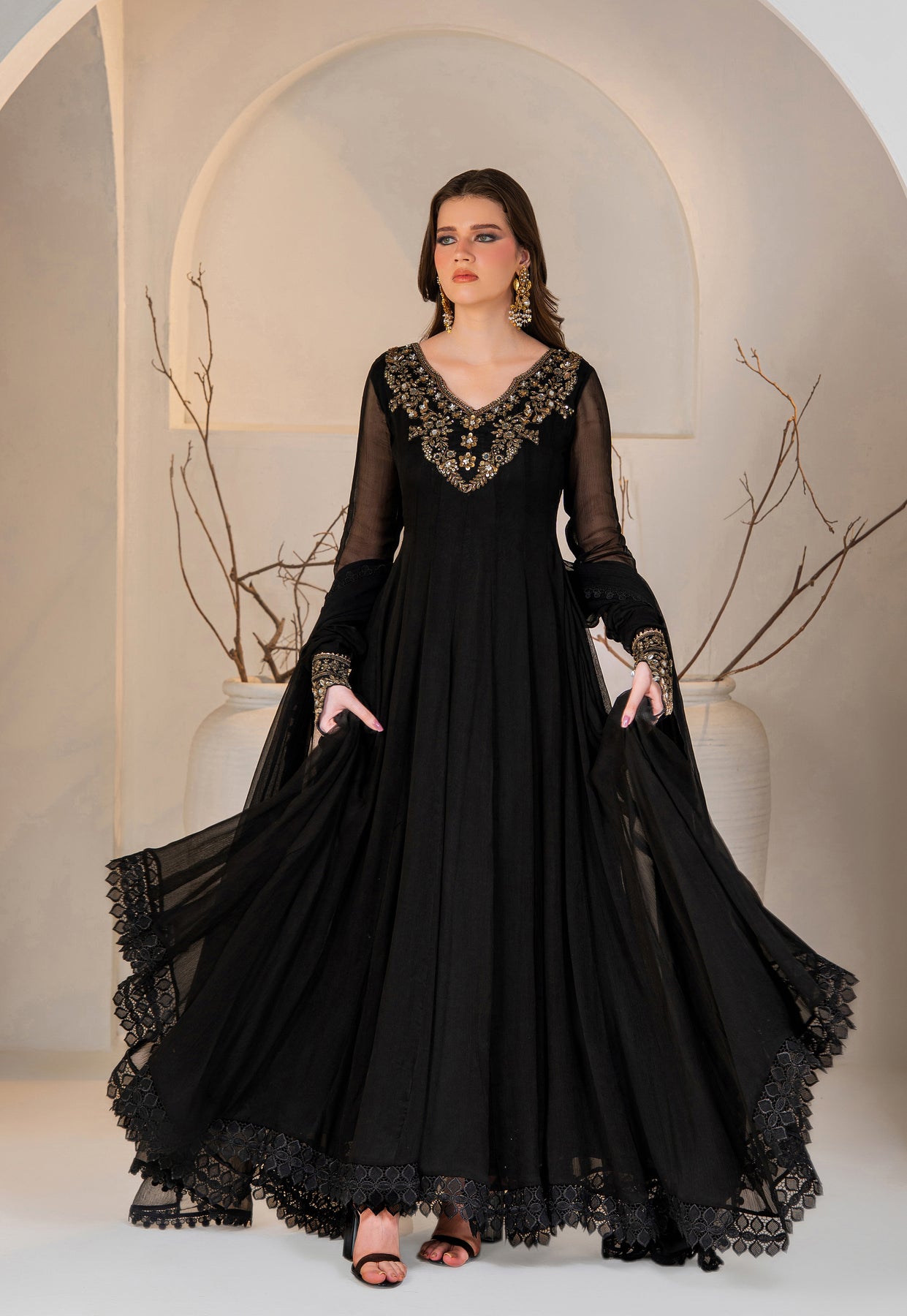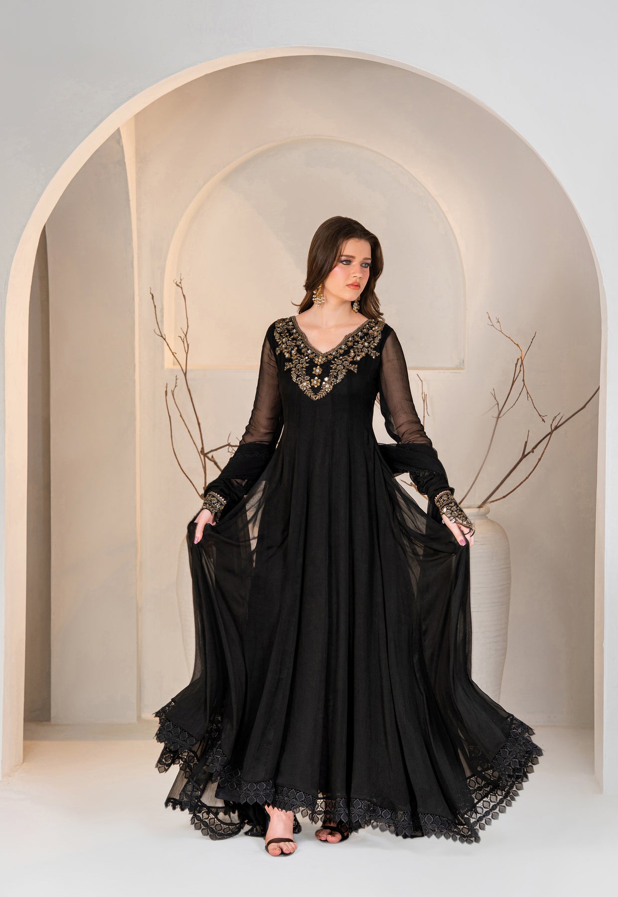 Introducing a masterpiece from Kashee’s Naaz Collection | VOL-1, this luxury black chiffon frock is designed for women who appreciate elegance, grace, and timeless beauty.