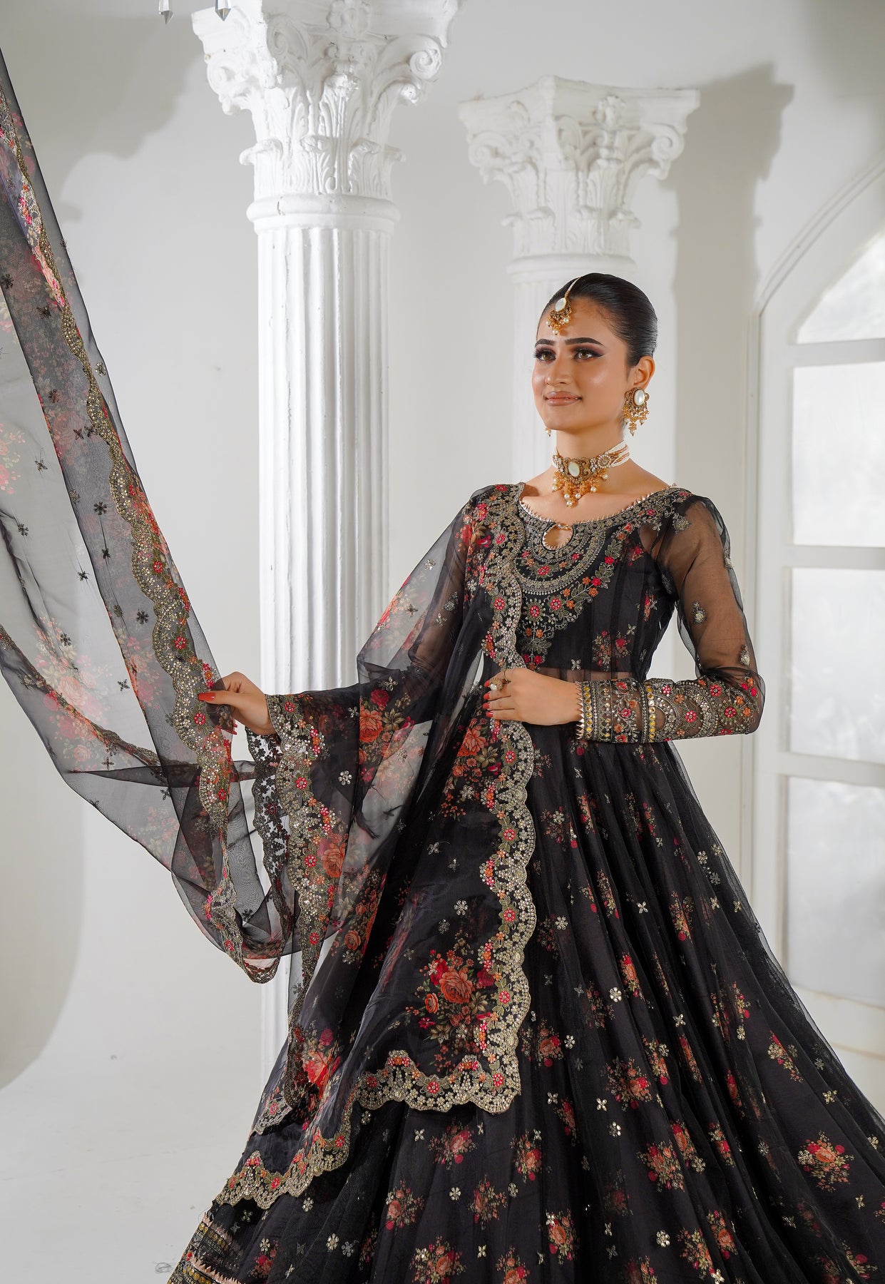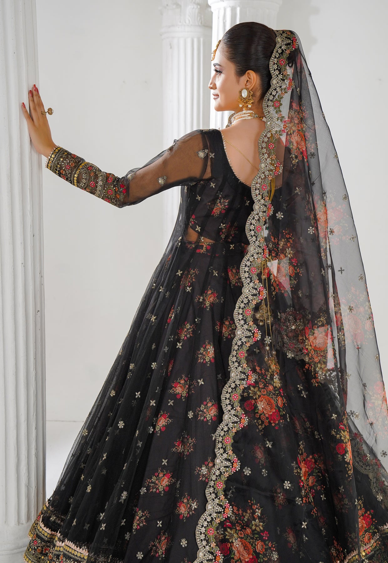 A luxurious organza in a rich Black tone, gracefully flowing with an elegant trail. spread delicately all over, featuring a regal mix of gold zari, gold dory, sitara, dabka, kundan, sheesha, cut dana, and pearl work. A four-sided embroidered border enchance its randeure, finished with refined gold thread detailing for a truly royal bridal finish.