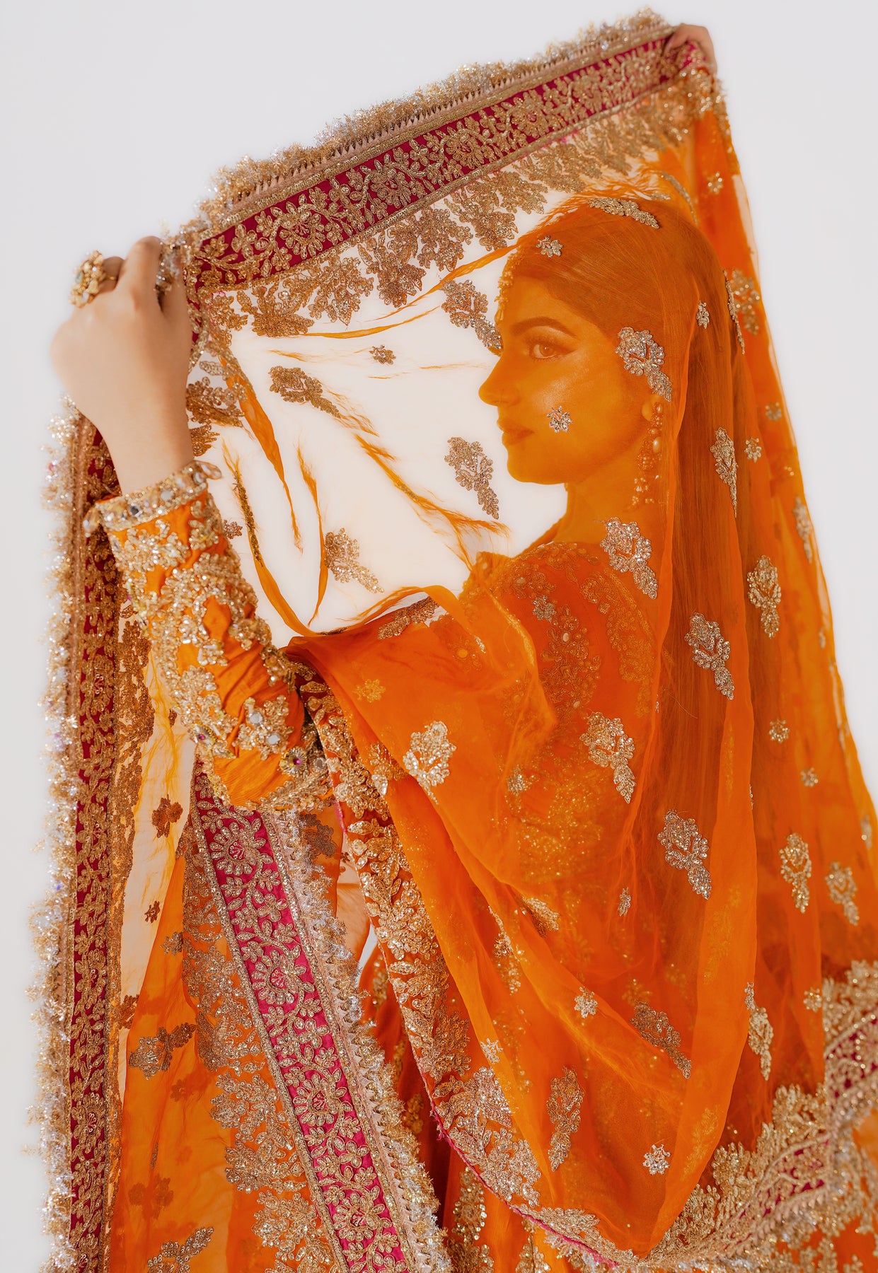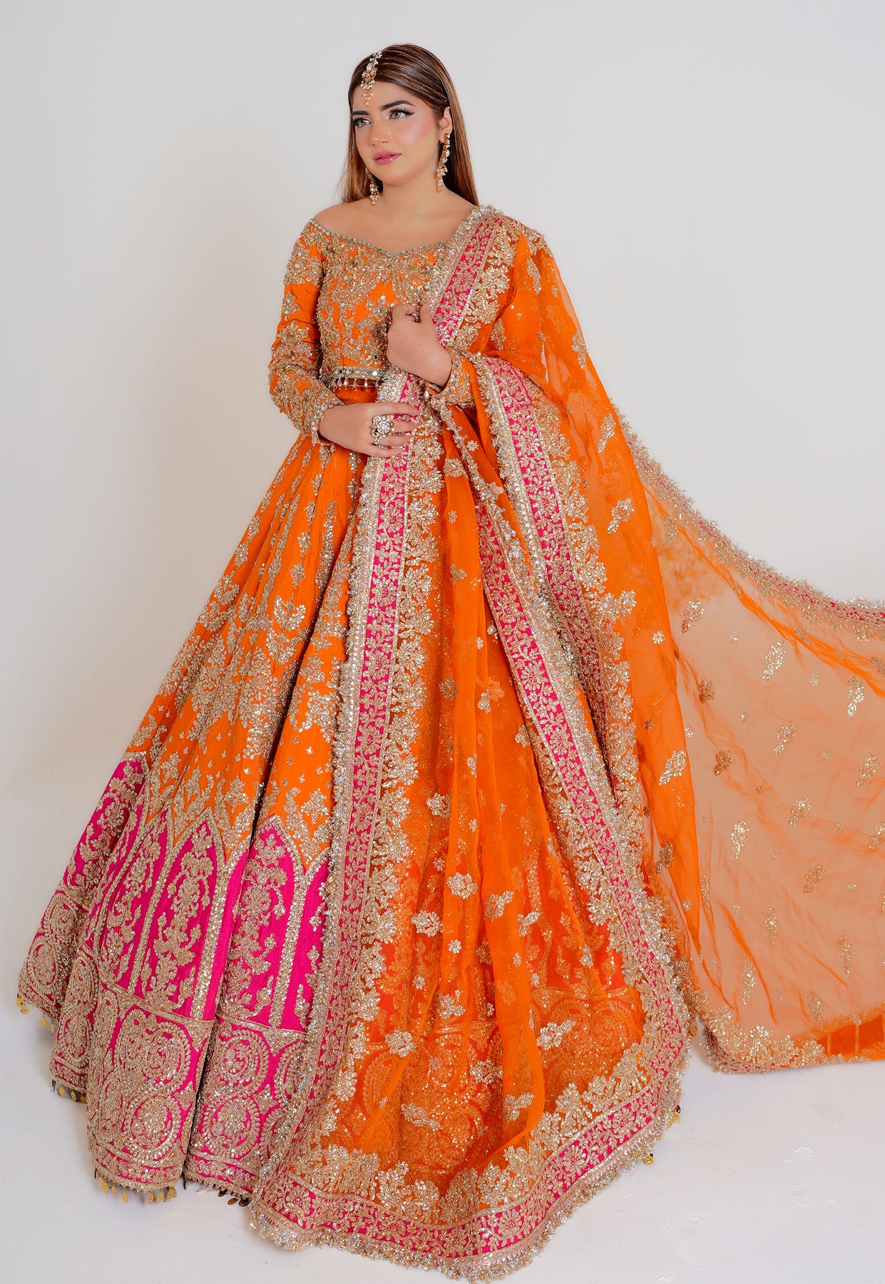 The lehenga is paired with a beautifully embellished blouse and a sheer orange dupatta finished with ornate pink and gold borders, adding a graceful contrast and regal charm. The flowy flare, rich textures, and flawless finishing make it ideal for mehndi, barat, wedding ceremonies, and grand bridal events.