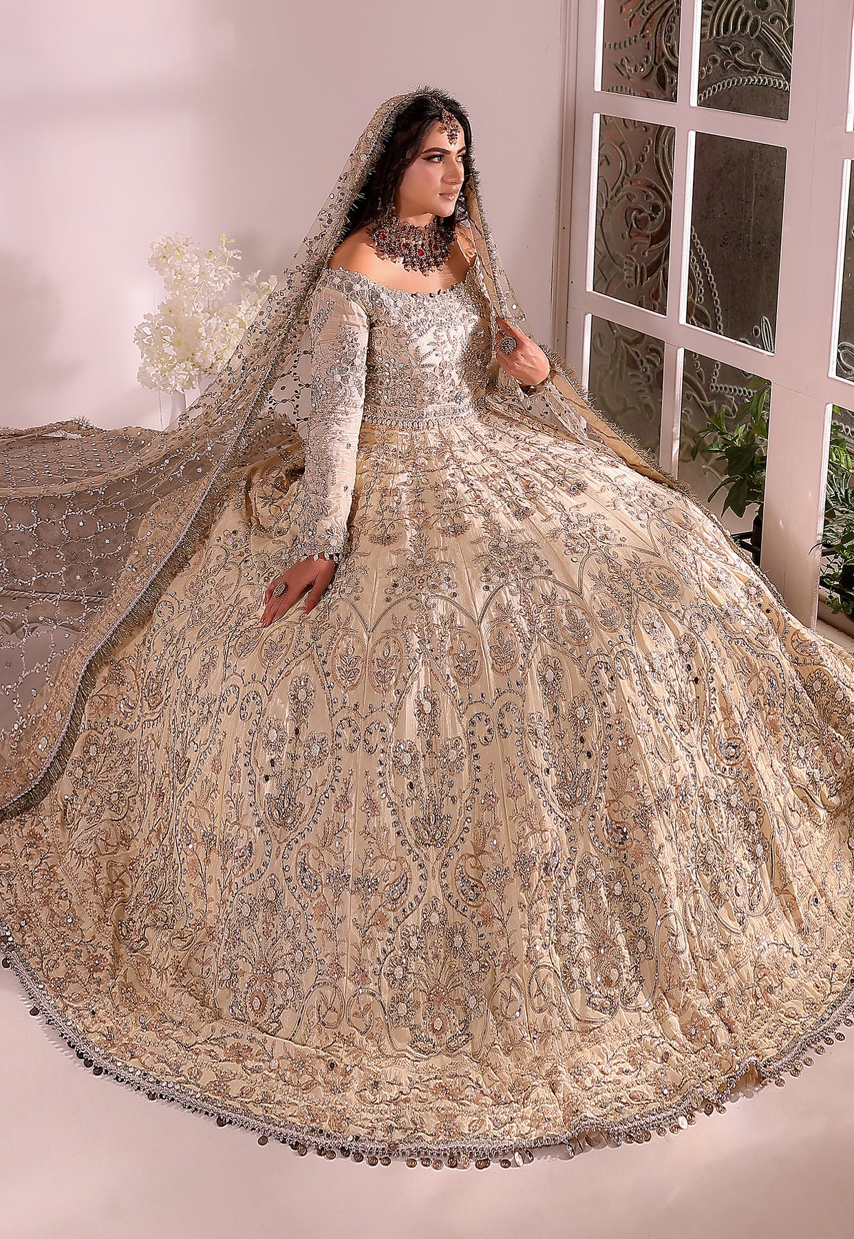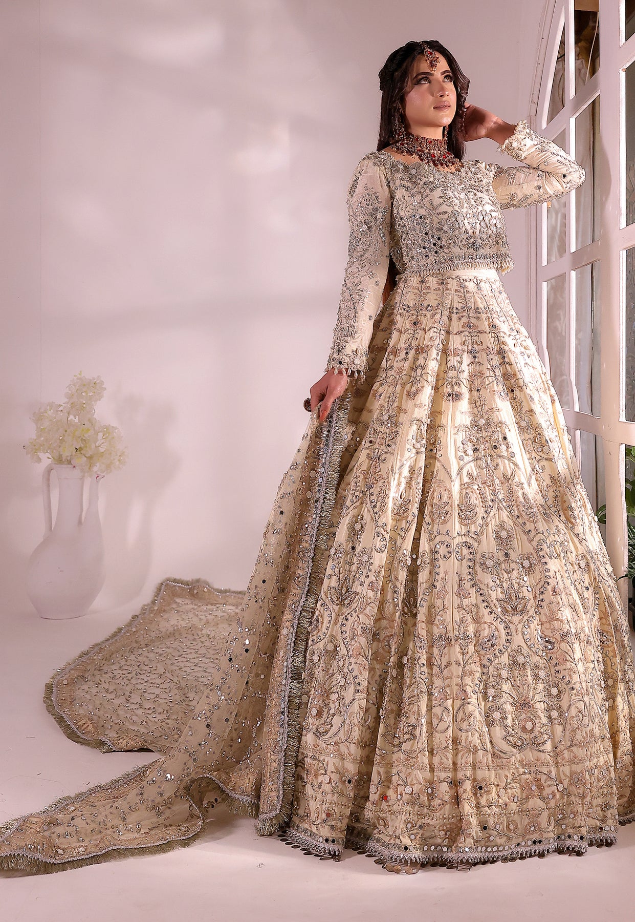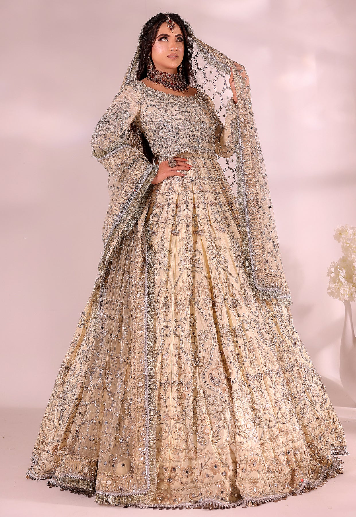 This elegant Kashees Bridal Wear | KBW-104 | ivory bridal lehenga by Kashee’s Couture is exquisitely handcrafted with heavy hand embroidery using antique gold zari, dabka, sequins, and delicate mirror work, creating a refined and luminous surface. The structured bodice is precisely tailored to enhance the silhouette, while the voluminous lehenga features densely worked panels with evenly balanced embellishments for graceful movement and a flawless fall. A finely embroidered net dupatta with detailed borders completes the ensemble, adding softness and harmony. Premium stitching, couture-level finishing, and meticulous craftsmanship make this outfit ideal for weddings and bridal receptions — a timeless creation among the best bridal dress in Pakistan.