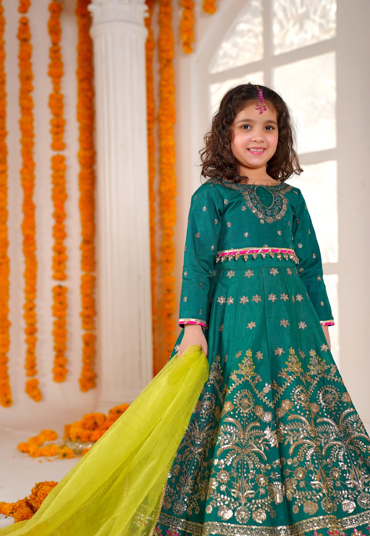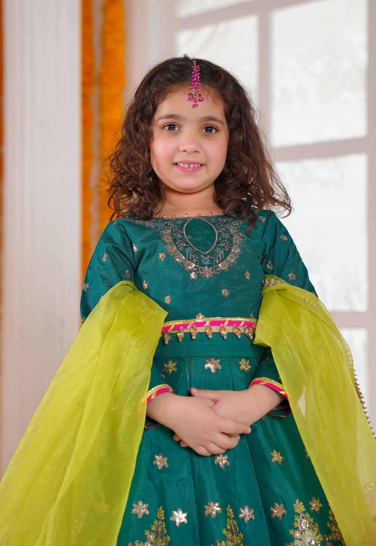 A graceful emerald green kids lehenga adorned with intricate gold thread embroidery and a richly detailed border with floral work adding volume and a fairytale-inspired finish.
