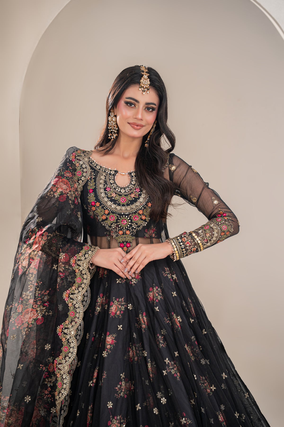 A luxurious organza in a rich Black tone, gracefully flowing with an elegant trail. spread delicately all over, featuring a regal mix of gold zari, gold dory, sitara, dabka, kundan, sheesha, cut dana, and pearl work. A four-sided embroidered border enchance its randeure, finished with refined gold thread detailing for a truly royal bridal finish.