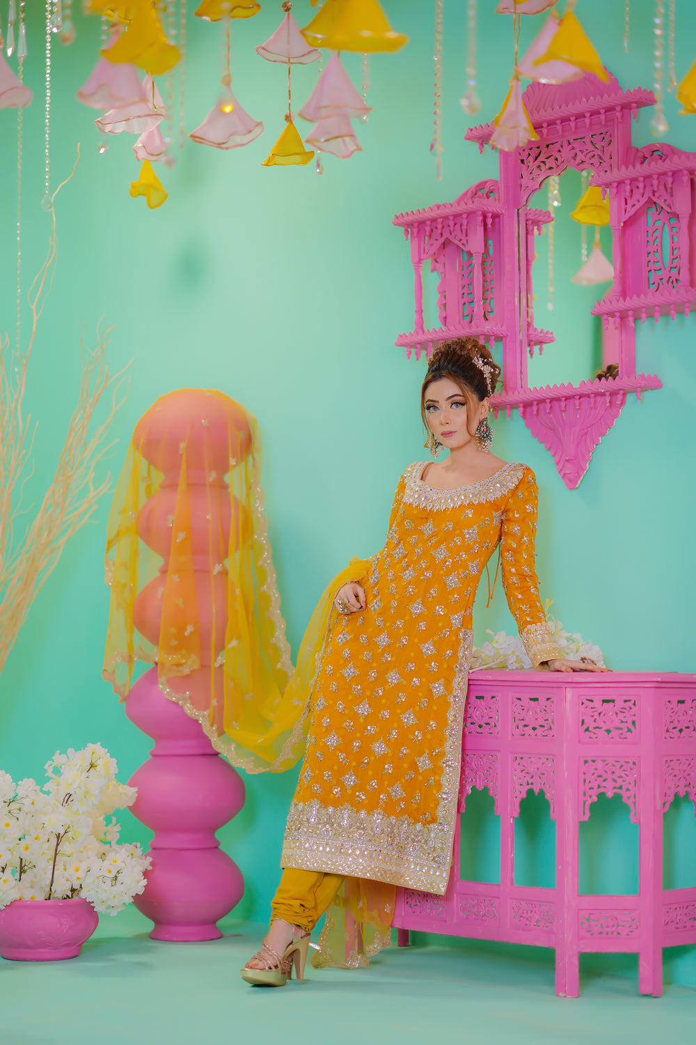 Its warm mustard tone symbolizes joy, confidence, and celebration — perfect for mehndi, dholki, or festive gatherings.