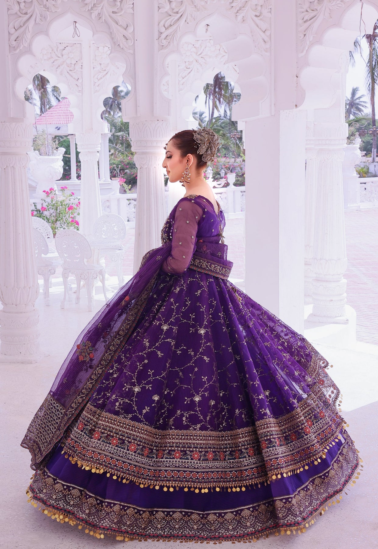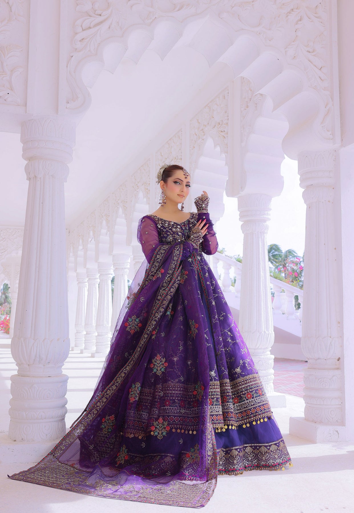 A luxurious organa dupatta in a rich purple tone, gracefully flowing with an elegant trail. The dupatta is adorned with heavy traditional  embroidery spread delicately all over, featuring a regal mix of  attique gold zari, sitara, sheesha . A four-sided embroidered border enhances its grandeur, finished with refined gota Lace detailing for a truly royal bridal finish.