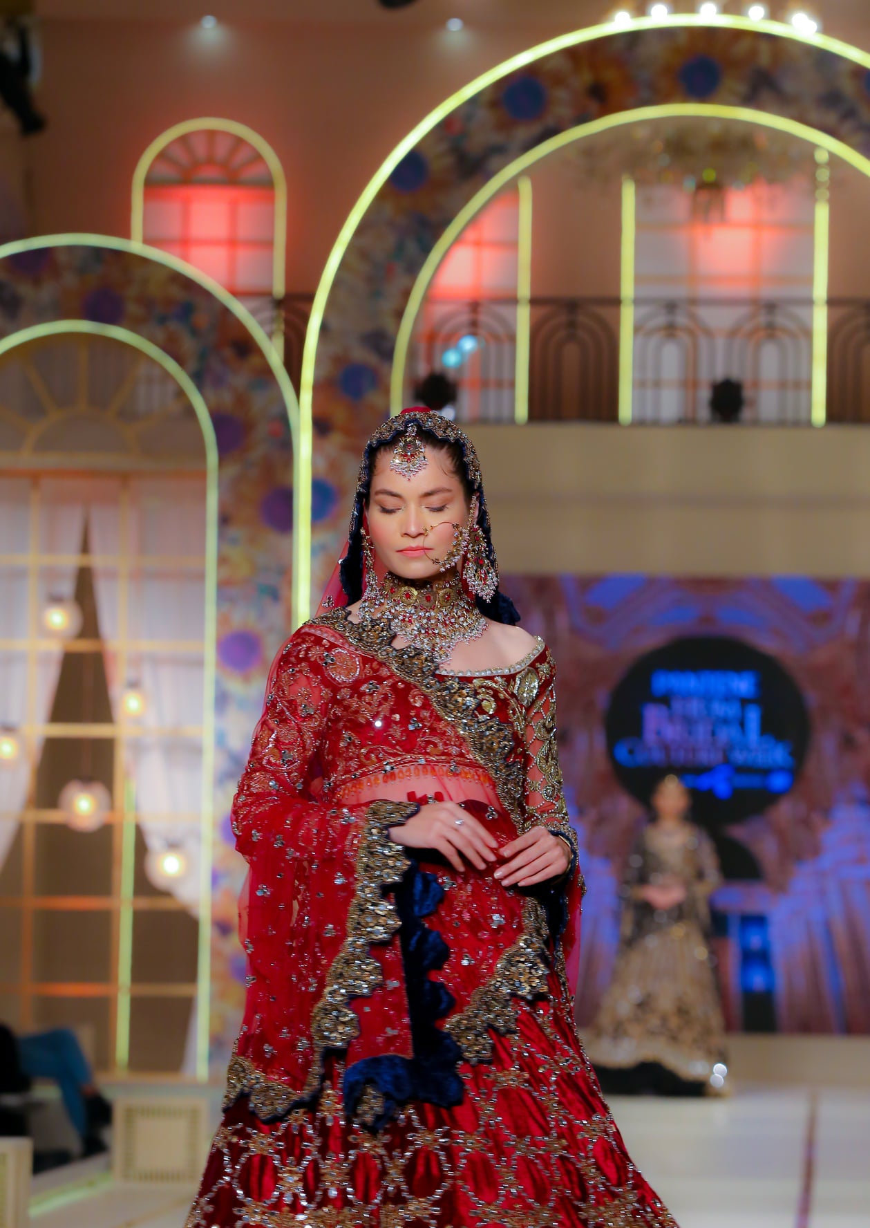 This majestic Bridal Festive Barat Collection | KBFBC-017 | red bridal lehenga by Kashee’s Couture is crafted with exceptional precision, featuring heavy hand embroidery using antique gold zari, dabka, sequins, and detailed threadwork arranged in rich traditional motifs. The expertly structured blouse enhances the silhouette, while the voluminous lehenga showcases densely worked panels with evenly balanced embellishments for a graceful, flowing fall. A finely embroidered net dupatta completes the ensemble, adding depth and harmony to the richly embellished design. Premium stitching, couture-level finishing, and meticulous craftsmanship make this outfit ideal for barat ceremonies — a regal choice among the best bridal dress in Pakistan.