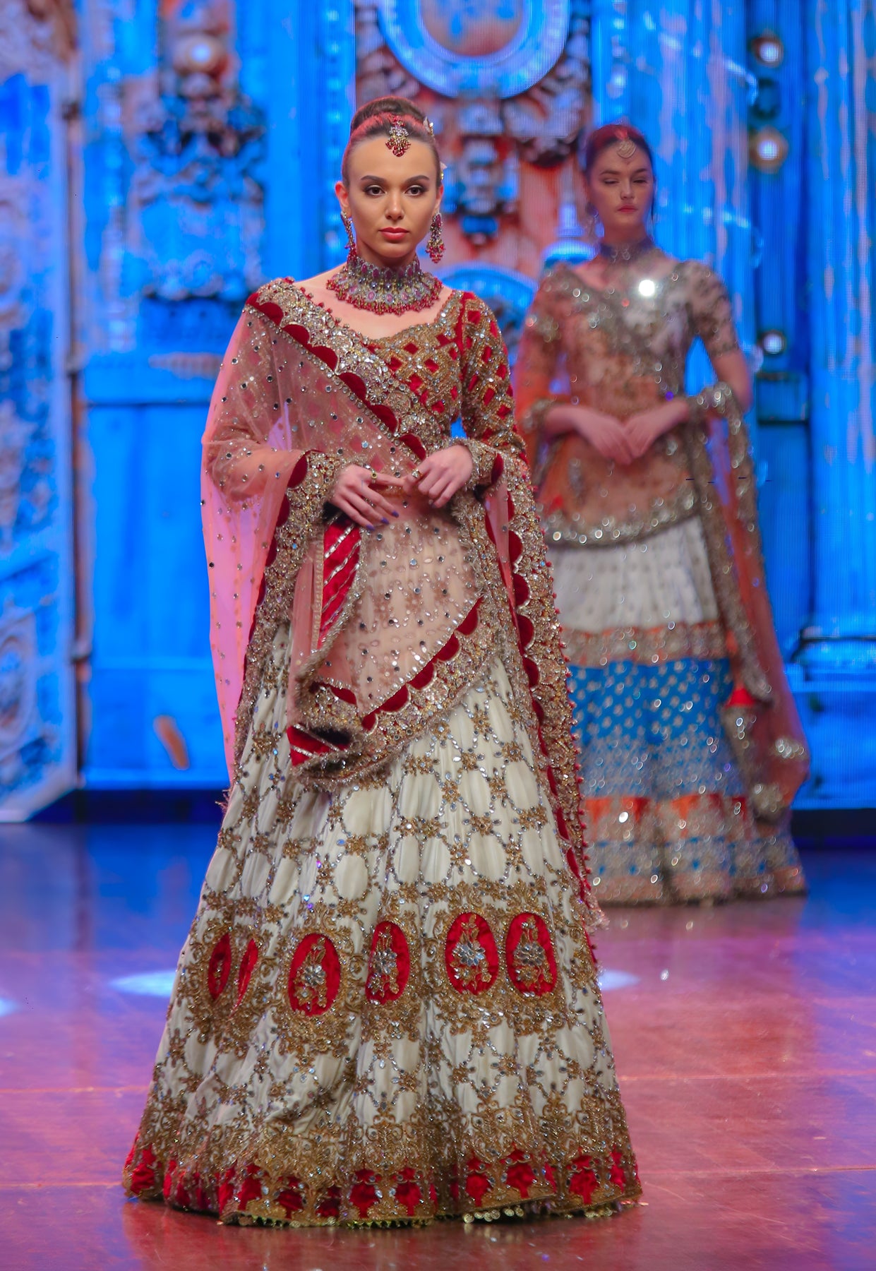 This refined Kashees Bridal Wear | KBW-115 | ivory bridal lehenga by Kashee’s Couture is meticulously crafted using premium net and velvet fabric, enhanced with a flawless combination of machine embroidery and intricate handwork. Antique gold zari, dabka, sequins, and mirror embellishments are carefully applied across the bodice, lehenga panels, and borders to create rich texture and depth. The expertly structured bodice offers a flattering, supportive fit, while the voluminous lehenga features evenly distributed motifs and a richly finished hem for smooth movement and an elegant fall. A delicately embellished net dupatta completes the ensemble, adding balance and sophistication. Precision stitching, couture-level finishing, and master craftsmanship make this bridal outfit ideal for weddings and receptions — a timeless creation among the best bridal dress in Pakistan.